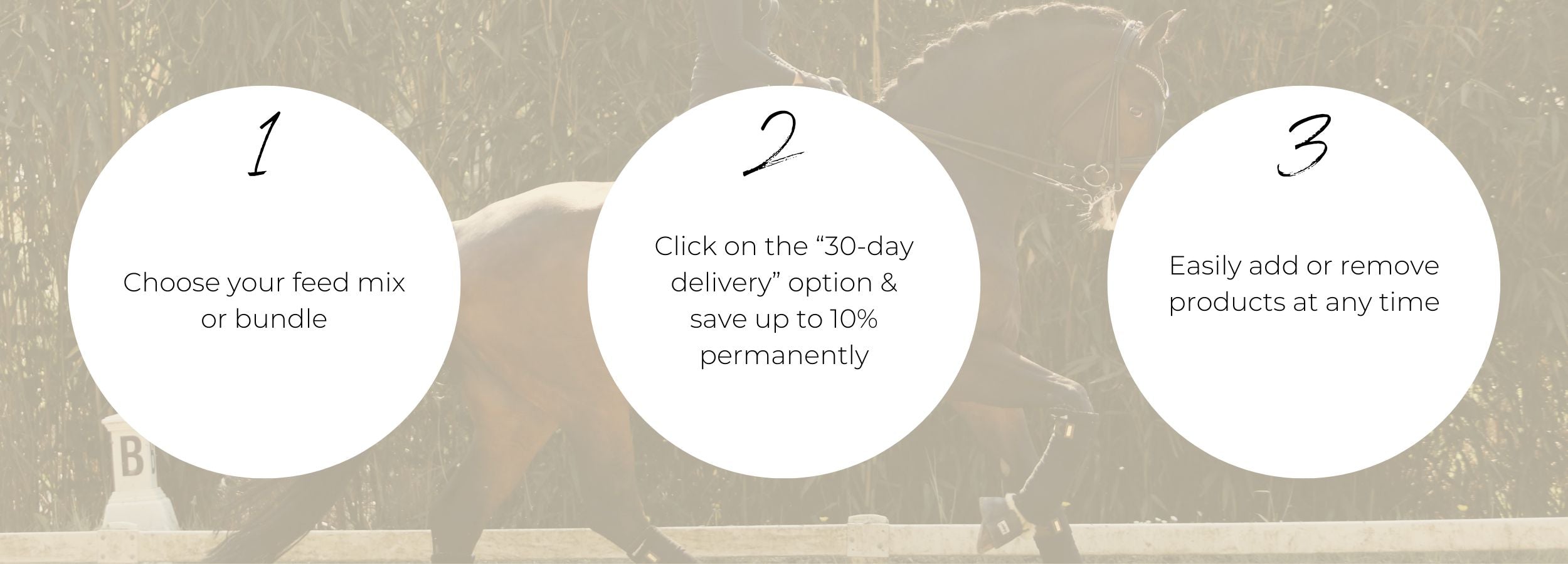 So you can concentrate fully on yourself and your horse, we automatically deliver your supplementary feed. Every 30 days, you'll receive your products at your preferred address, and you can also save money.