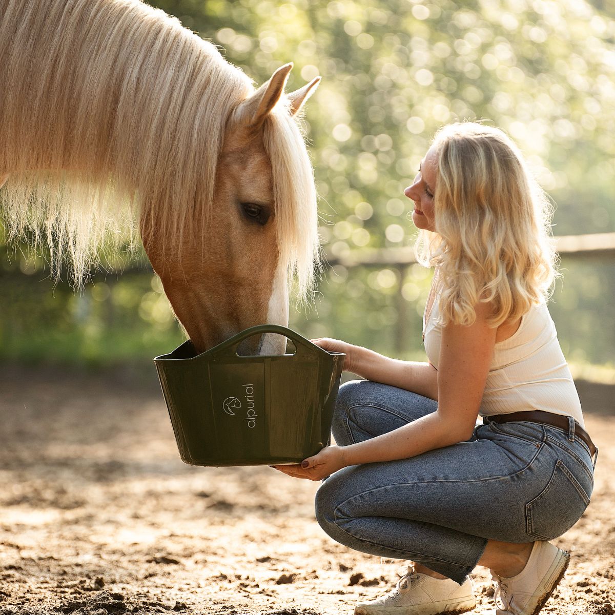 The Alpurial Flexi Bowl has a diameter of 34 cm and holds 17 liters. The lid ensures a secure closure, keeping the feed well protected.
