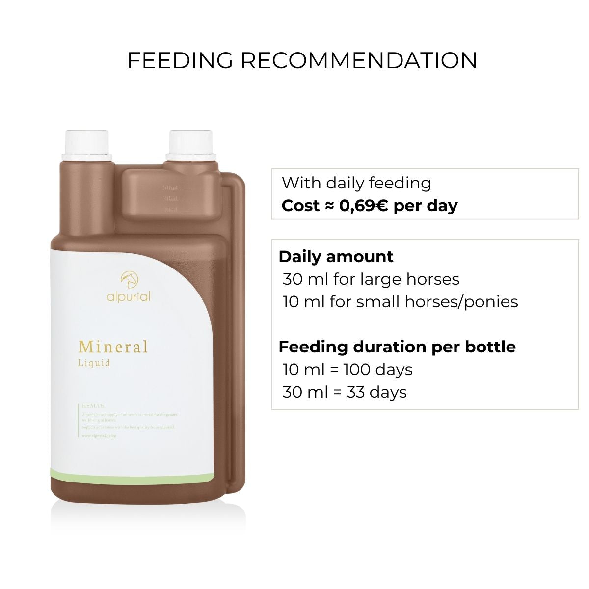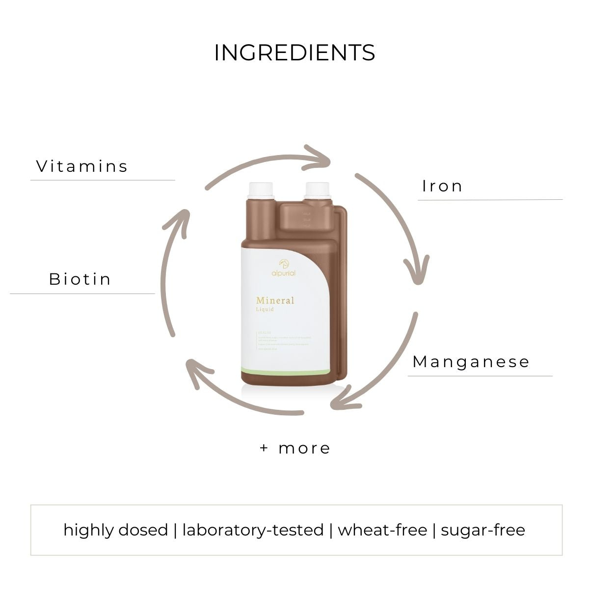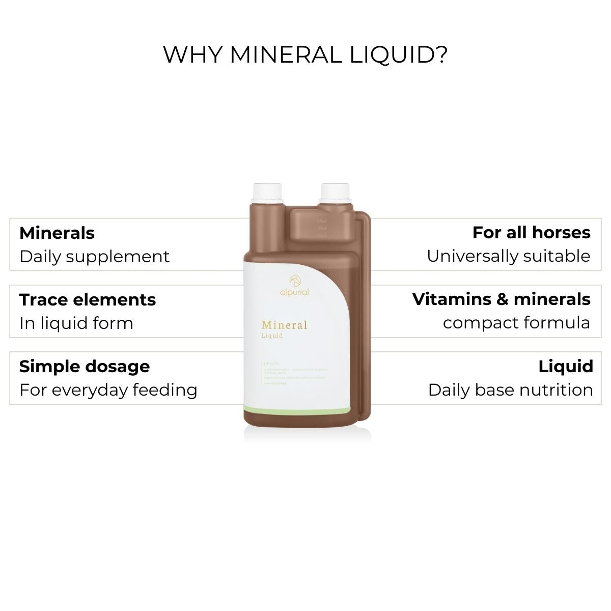 Alpurial Mineral Liquid is a complementary feed for horses that provides targeted support with minerals, electrolytes, and vitamins in liquid form. Its carefully balanced composition contributes to a consistent daily intake of nutrients – regardless of the horse’s age, season, or level of activity.