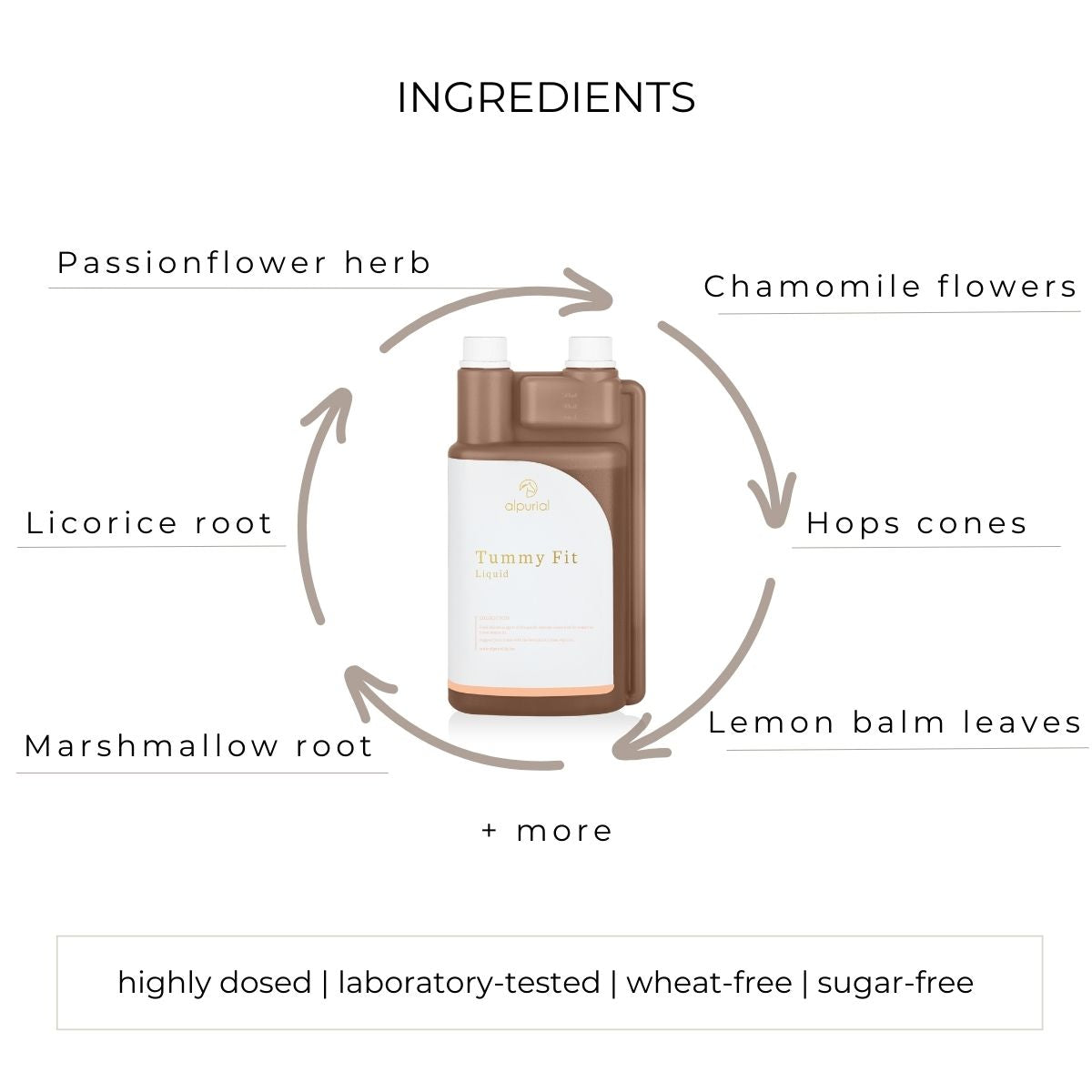 Tummy Fit by Alpurial is a well-designed complementary feed with natural ingredients such as marshmallow root, passion flower herb, chamomile blossoms, and lemon balm leaves – traditionally valued for their nutritional properties.