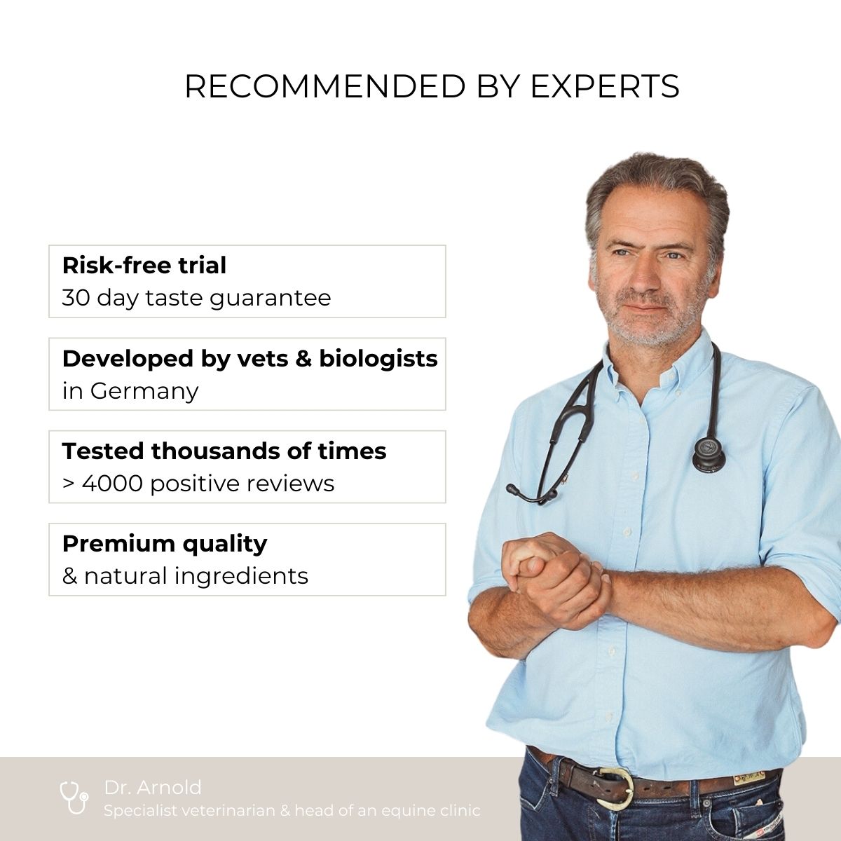 No worries – 99% of horses eat Tendon Strong without any problems when mixed with concentrate feed. You can also prepare it in mash. And if your horse doesn’t like it, our 30-day Taste Guarantee ensures you’ll get your money back.