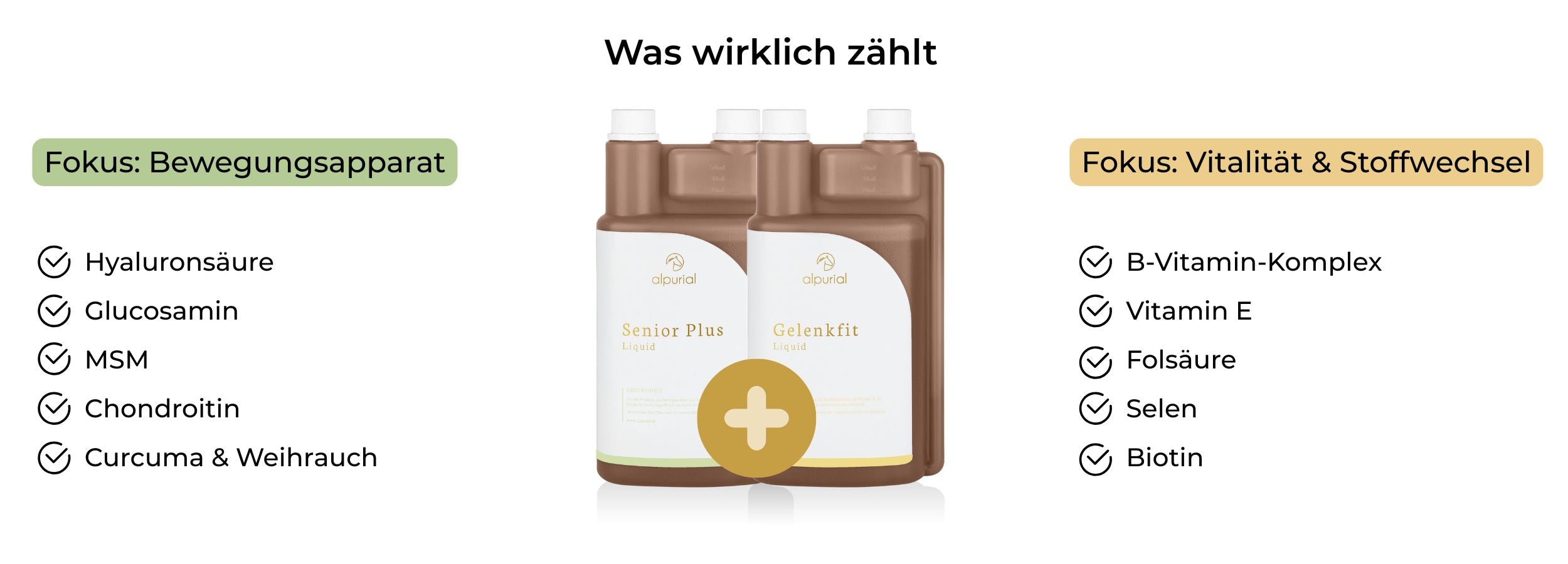 Beide Produkte enthalten ausgewählte Inhaltsstoffe, die sich sinnvoll ergänzen und zur täglichen Fütterung bei alterstypischen Herausforderungen beitragen können – z. B. bei erhöhter Beanspruchung von Stoffwechsel, Verdauung oder Bewegungsapparat.
