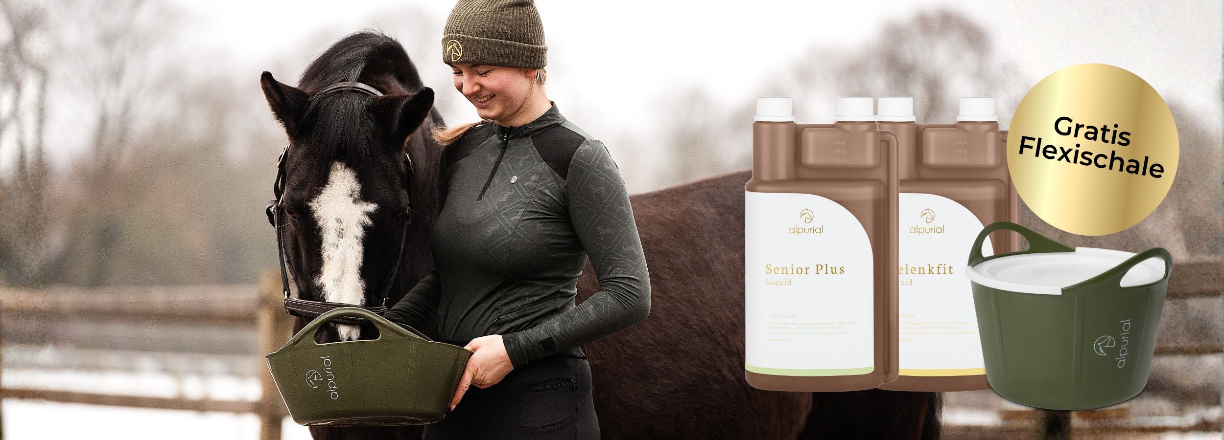 Das Senior Bundle von Alpurial kombiniert die beiden Ergänzungsfuttermittel Gelenkfit und Senior Plus – abgestimmt auf die Bedürfnisse älterer Pferde.